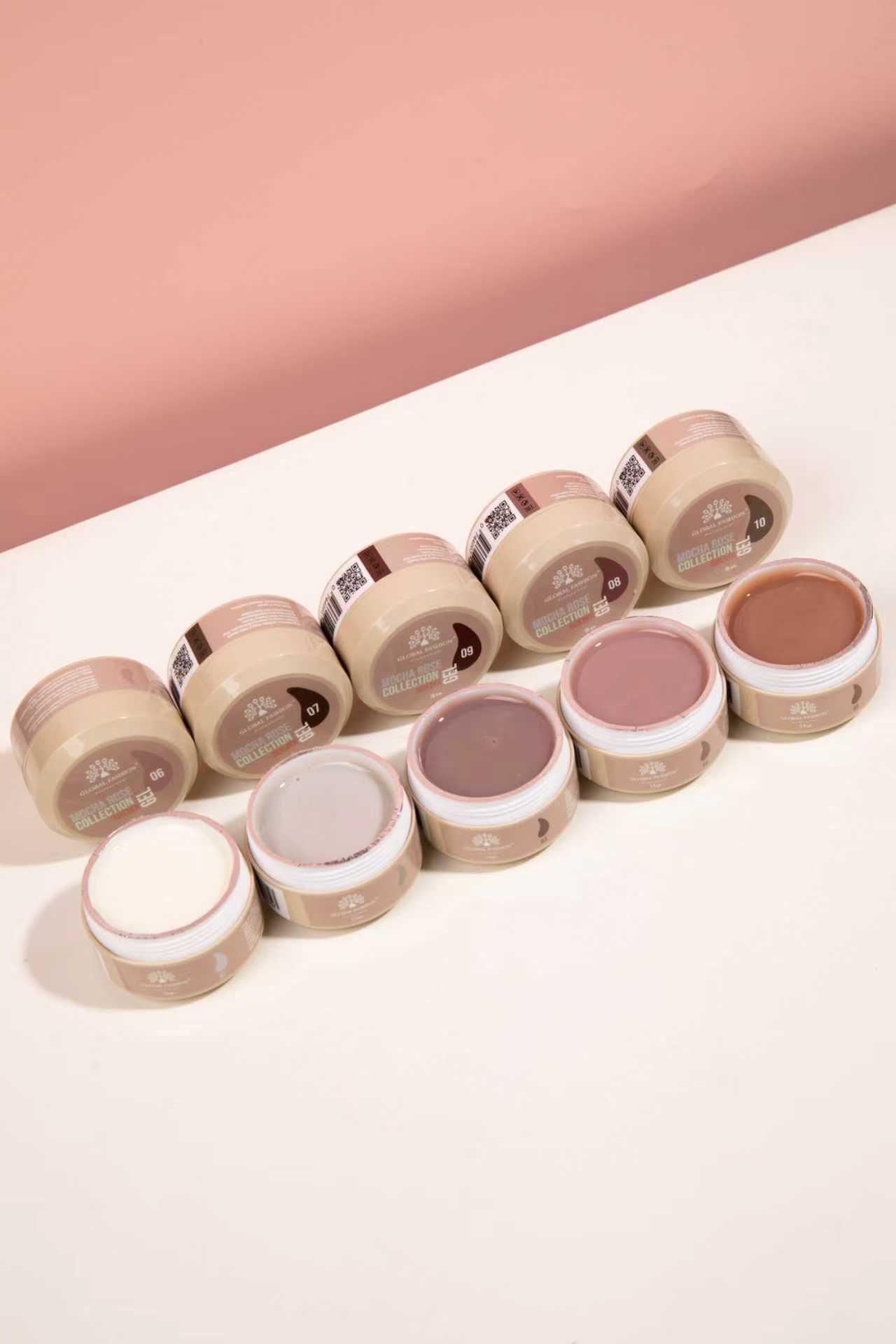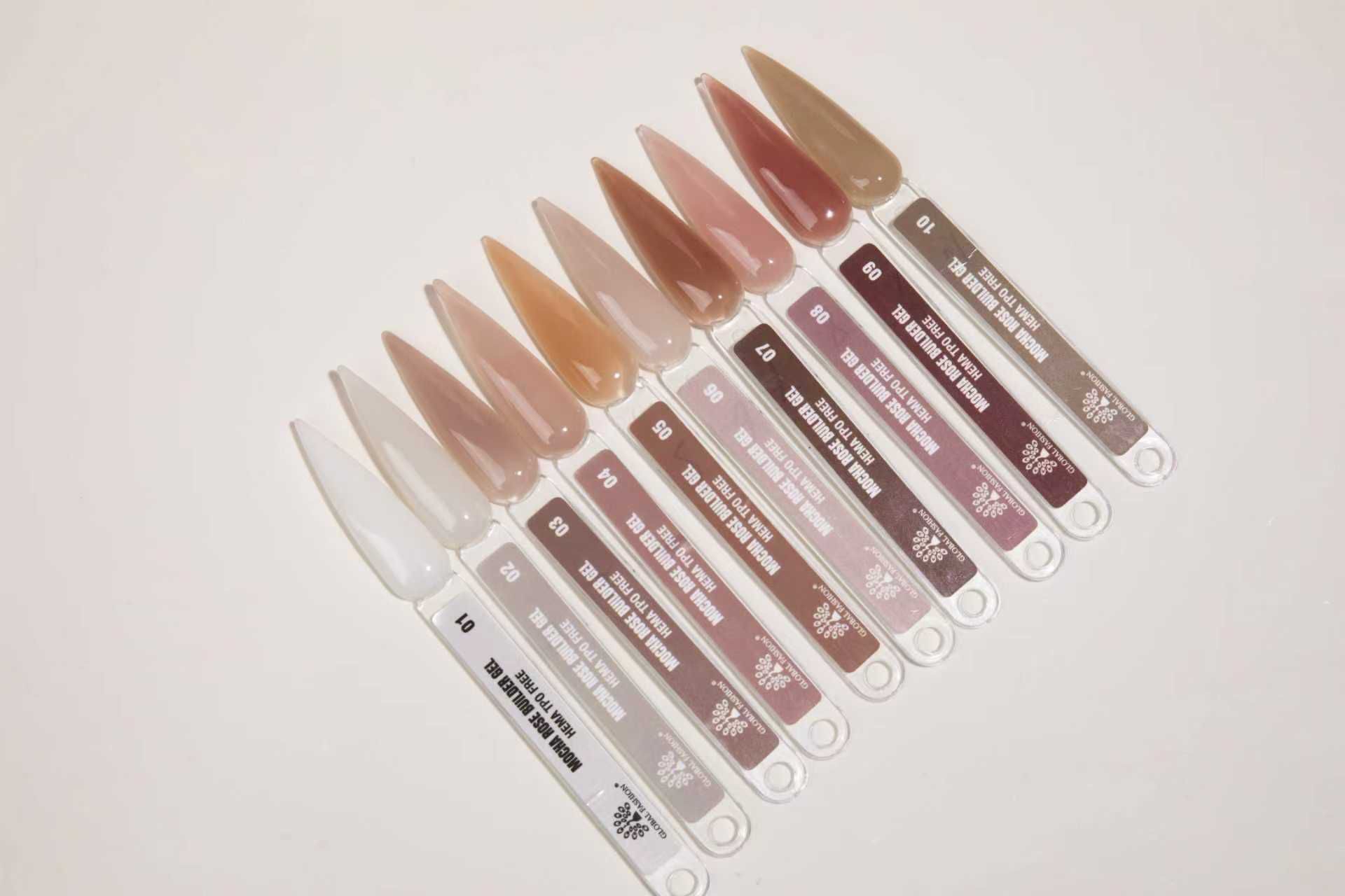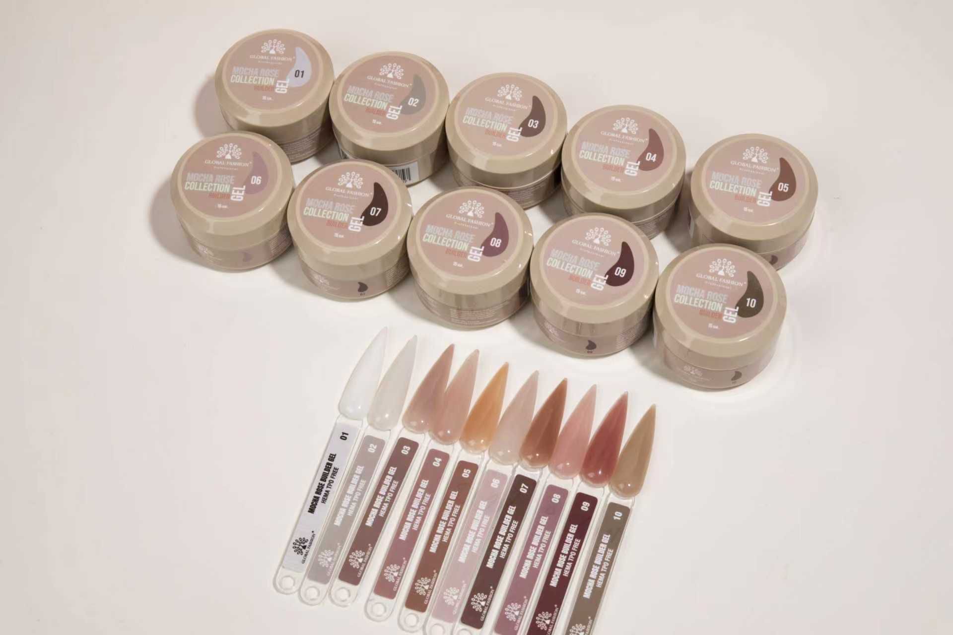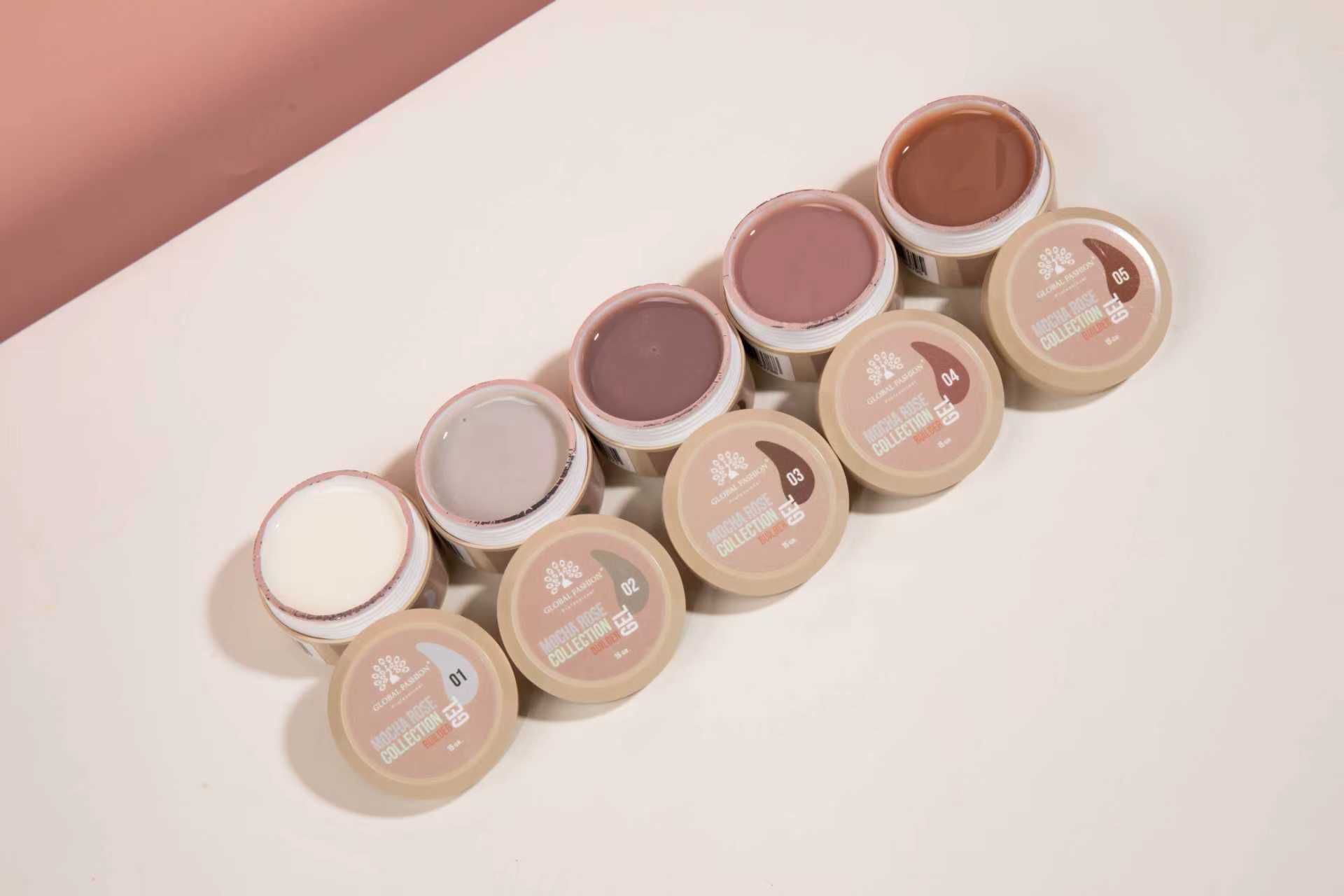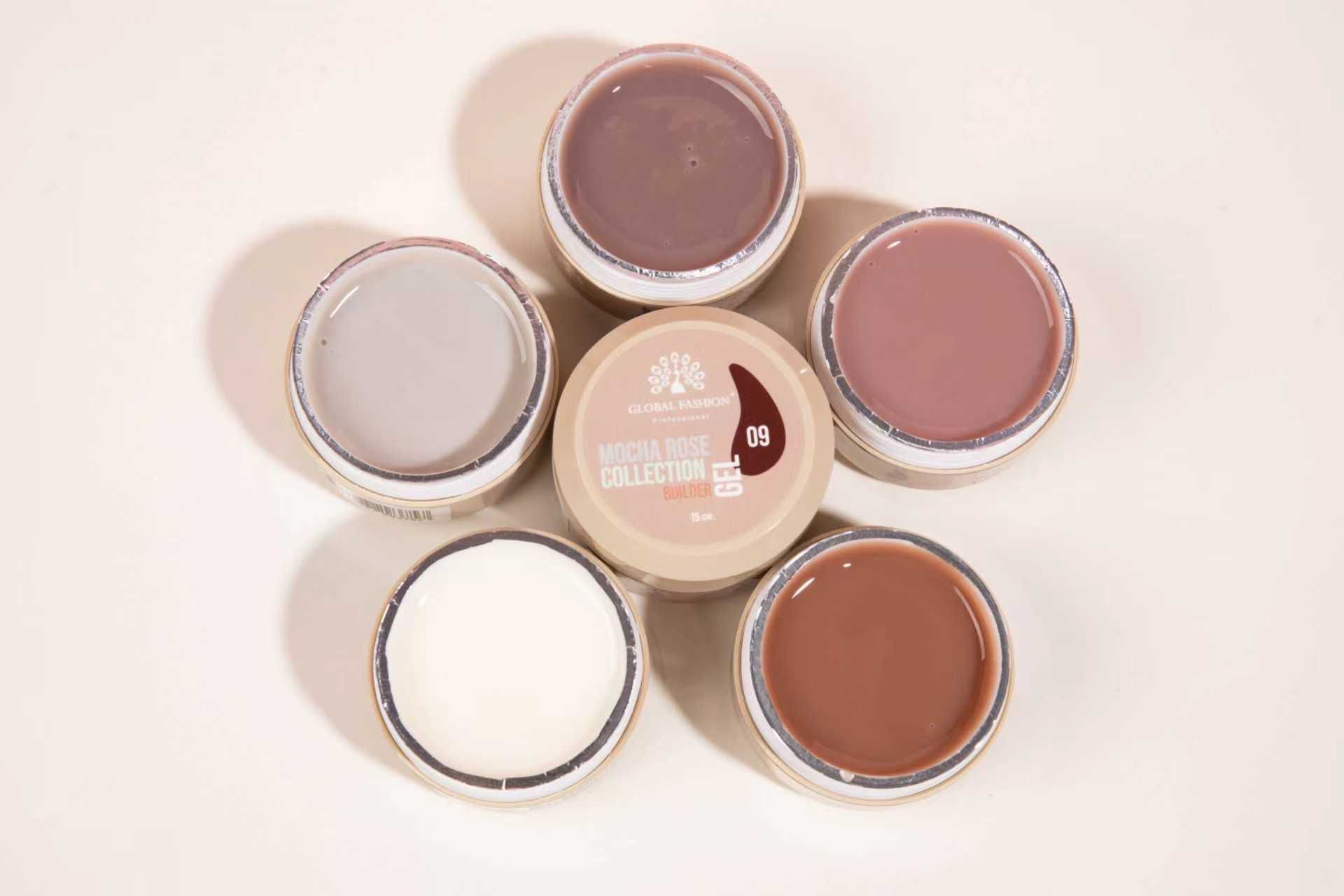 Представленные продукты — это камуфлирующие гели-билдеры Global Fashion Mocha Rose Collection для наращивания и моделирования ногтей.