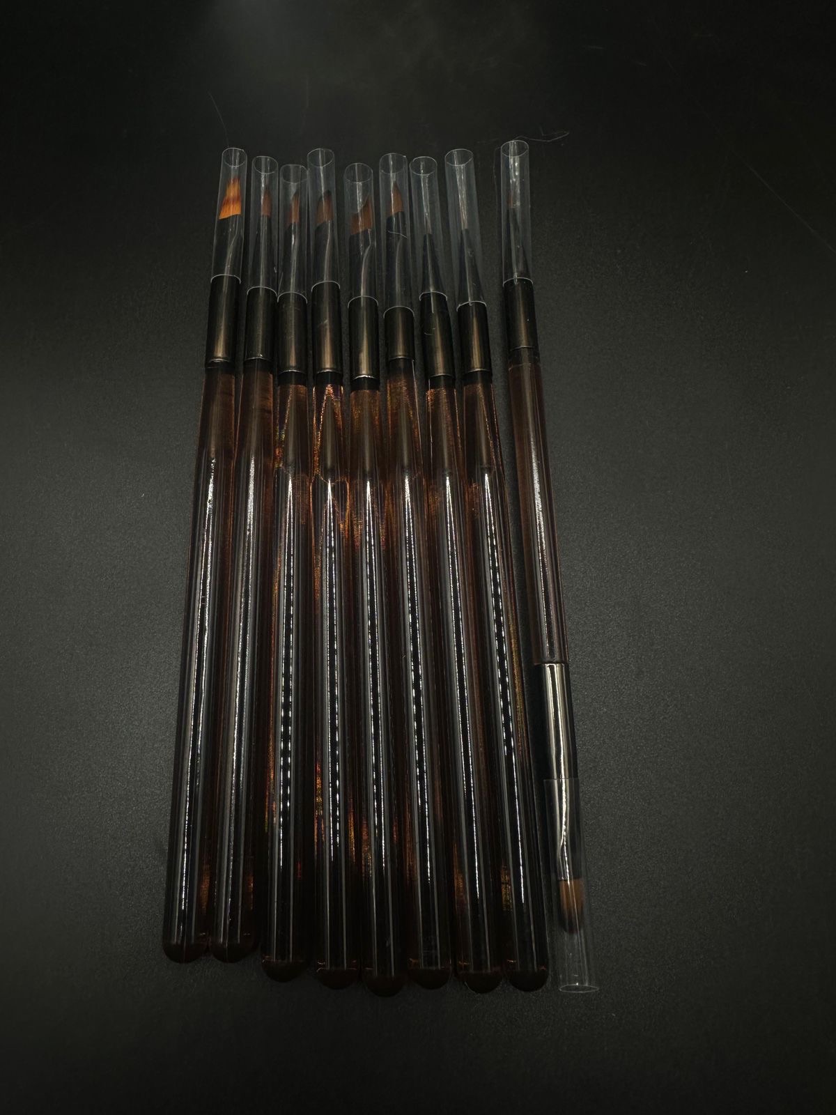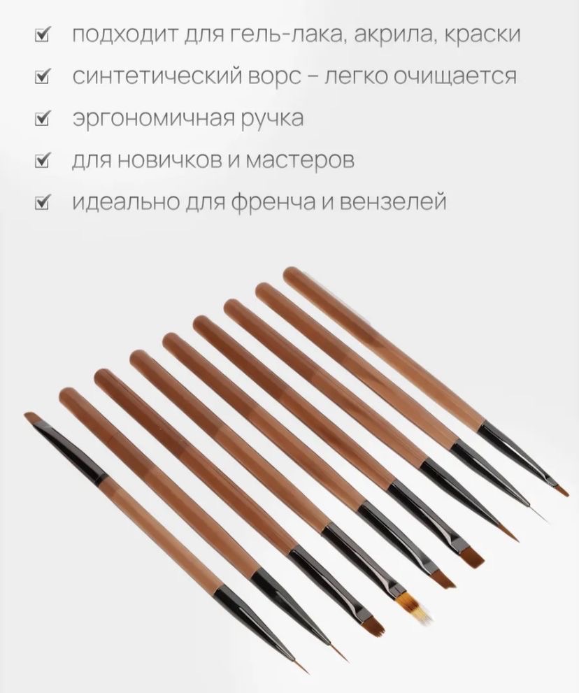 Профессиональные кисти незаменимый помощник для мастера маникюра. Набор оптимально собран для работы, он состоит из 9 кистей, одна из которых двухсторонняя. Кисти предназначены не только для росписи ногтей, а также используются в моделировании формы ногтей, выкладке материала, такого как гель, полигель, акрил. Высококачественное искусственное волокно не обладает мелкими чешуйками, проходит специальную обработку и получает свойства природного волоса колонка.Быстро отдают материал на поверхность типса или ногтя. Данные кисти по своим характеристикам упругие, но при этом мягкие, а также являются более износостойкими.