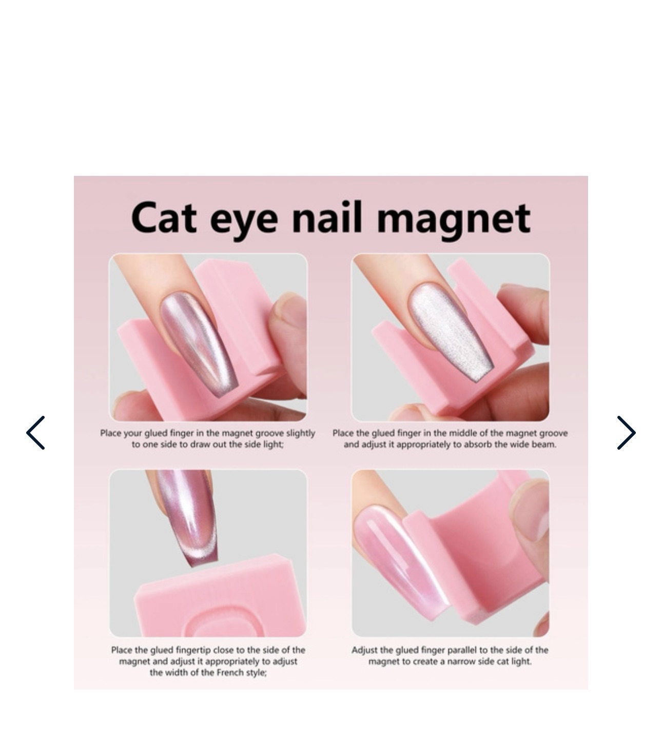 ❤️5D магнит "туннель" для хрустальной водной сатиновой кошки. Усиленный двухсторонний магнит "туннель" создан для дополнительных возможностей при работе с гель-лаками "Кошачий глаз". В отличие от обычных магнитных палочек, это устойчивая П-образная подставка с мощными встроенными неодимовыми магнитами. Вам не нужно держать магнит в руке - просто поместите ноготь внутрь конструкции и наслаждайтесь равномерным, профессиональным результатом. Преимущества магнитной подставки: Безупречный результат: равномерное распределение магнитных частиц без разрывов и смазанного рисунка. Стабильность и удобство: магнит зафиксирован, поэтому дрожание рук и нечеткие линии исключены.