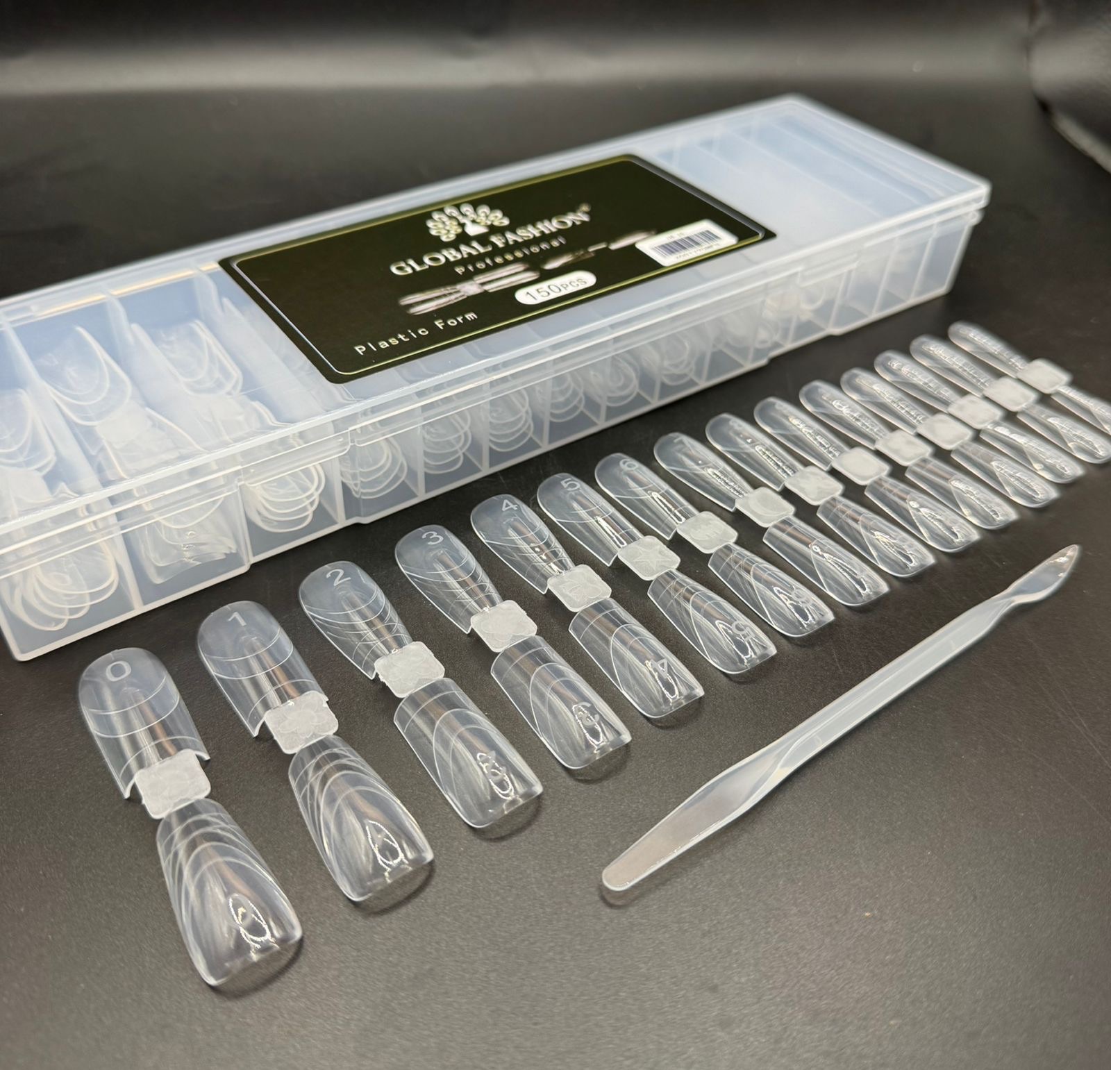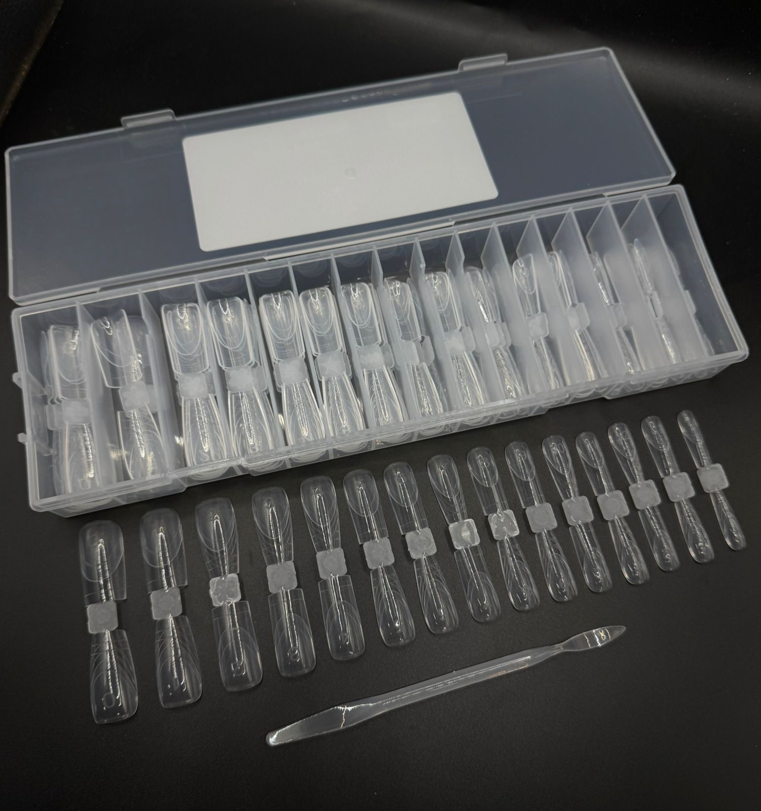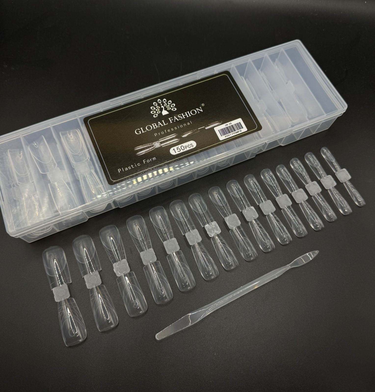 Эти многоразовые формы предназначены для быстрого и удобного моделирования искусственных ногтей с использованием таких материалов, как гель, акрил или полигель. Они позволяют создать максимально естественную арку и форму ногтя с минимальным последующим опиливанием. В комплекте идет пластмассовый нож с его помощью можно легко распределить гель в форме